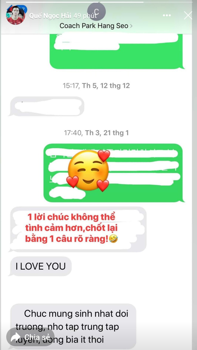 "I love you. Chúc mừng sinh nhật đội trưởng, nhớ tập trung tập luyện, uống bia ít thôi", HLV Park gửi lời chúc bằng tiếng Việt không dấu, đồng thời căn dặn cậu học trò. Sau đó, Quế Ngọc Hải bày tỏ: "Một lời chúc không thể tình cảm hơn, chốt lại bằng một câu rõ ràng".