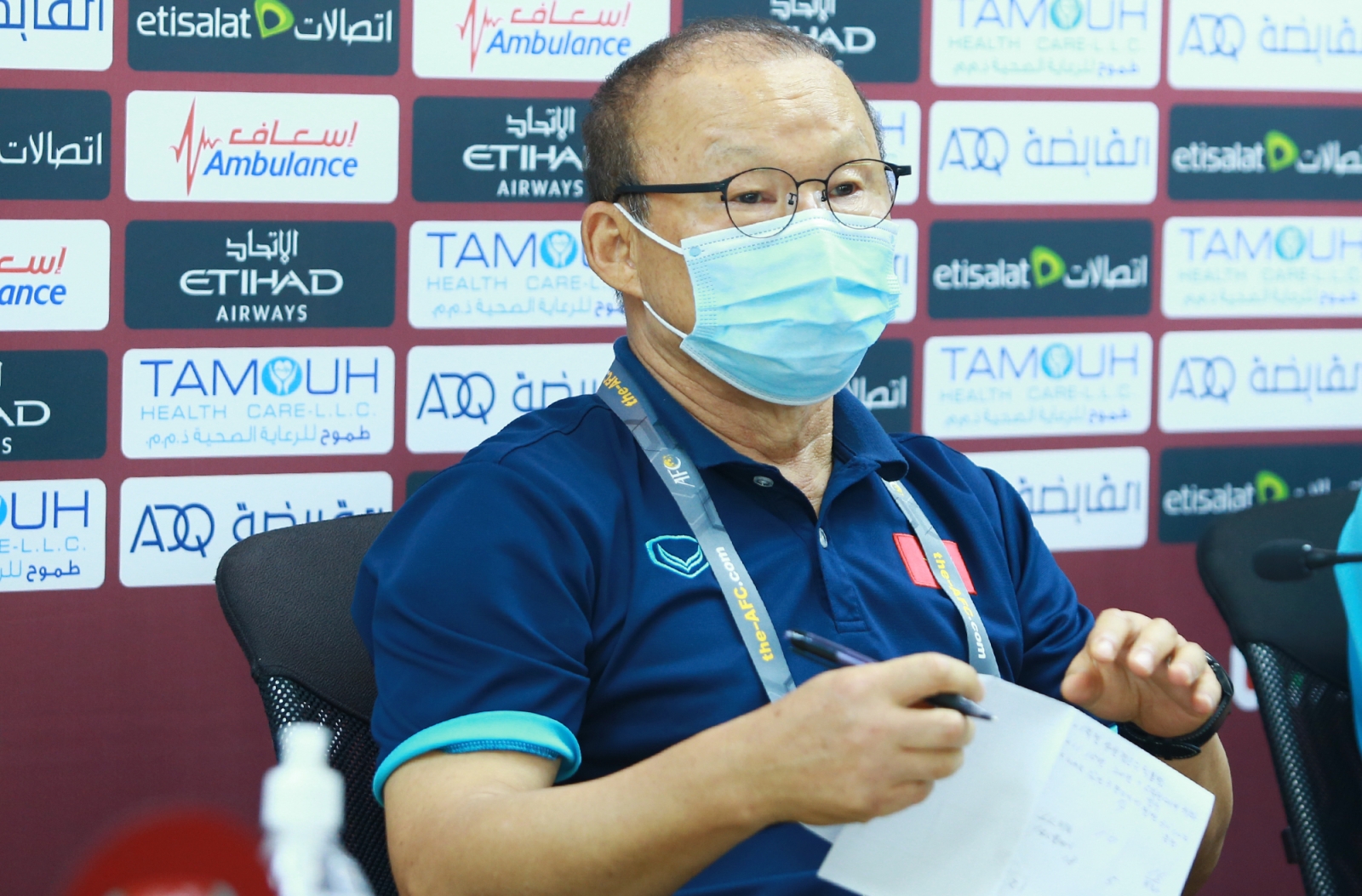 Khi đến họp báo trước trận UAE và Việt Nam, nhà cầm quân người Hàn Quốc mang theo tờ A4 có ghi chú thông tin về đối thủ và những nội dung quan trọng để trả lời báo chí.