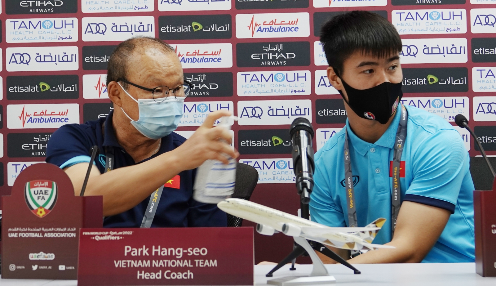 Trung vệ Đỗ Duy Mạnh là người được chỉ định cùng thầy Park đi dự họp báo. Trong lúc chờ đợi buổi làm việc chính thức bắt đầu, ông thầy người Hàn Quốc liên lục rửa tay sát khuẩn, đồng thời còn xịt cho Duy Mạnh.