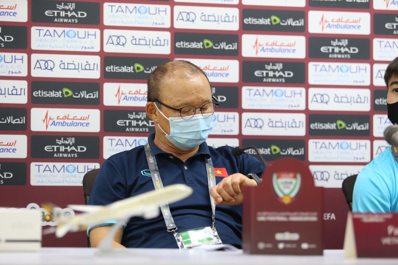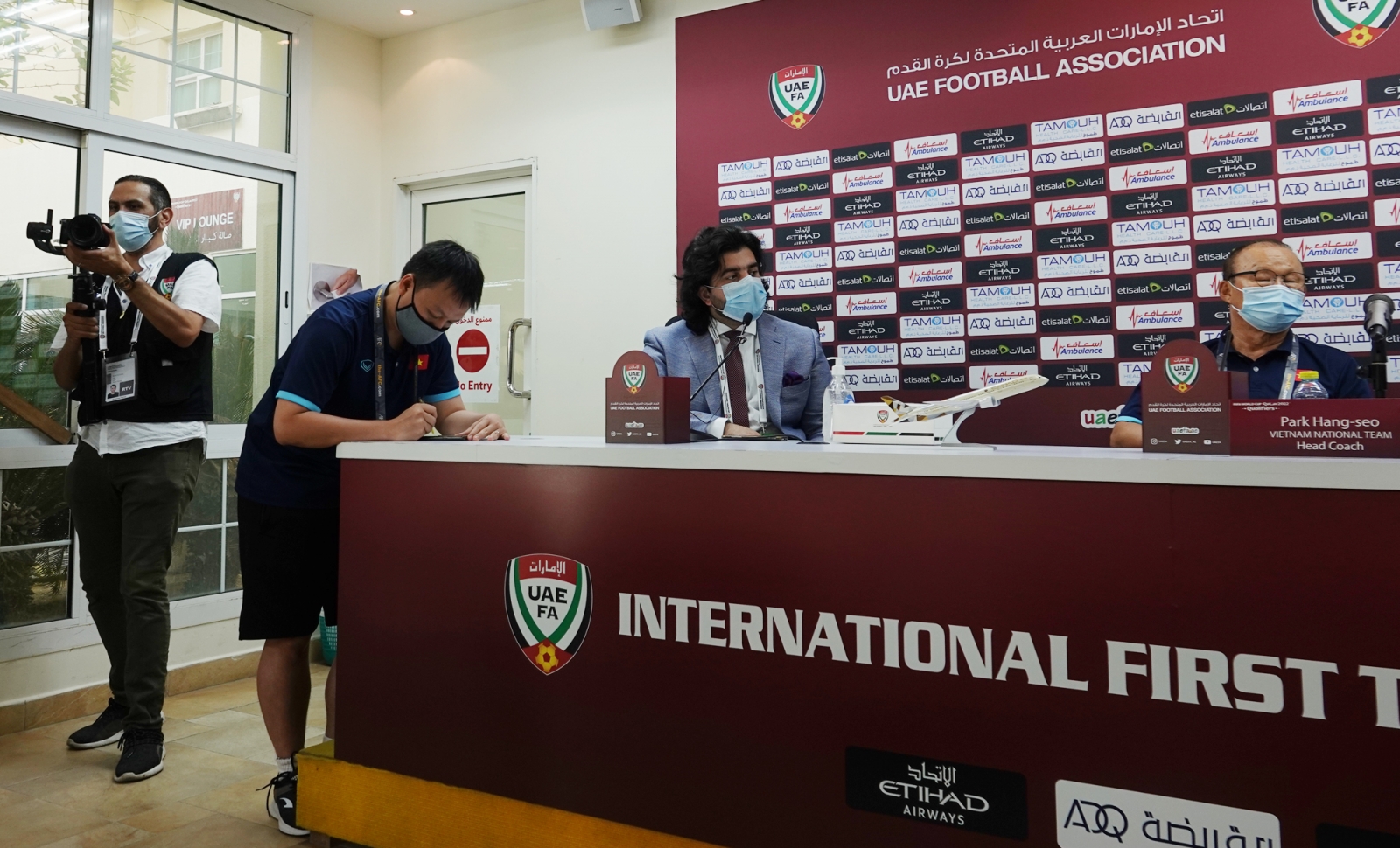 Tuy nhiên, một phóng viên ghi hình của UAE tiến lên ngang, thi thoảng lại đưa máy quay từ trên cao xuống như thể muốn ghi lại tờ giấy mà nhà cầm quân 62 tuổi đang cầm trên tay.