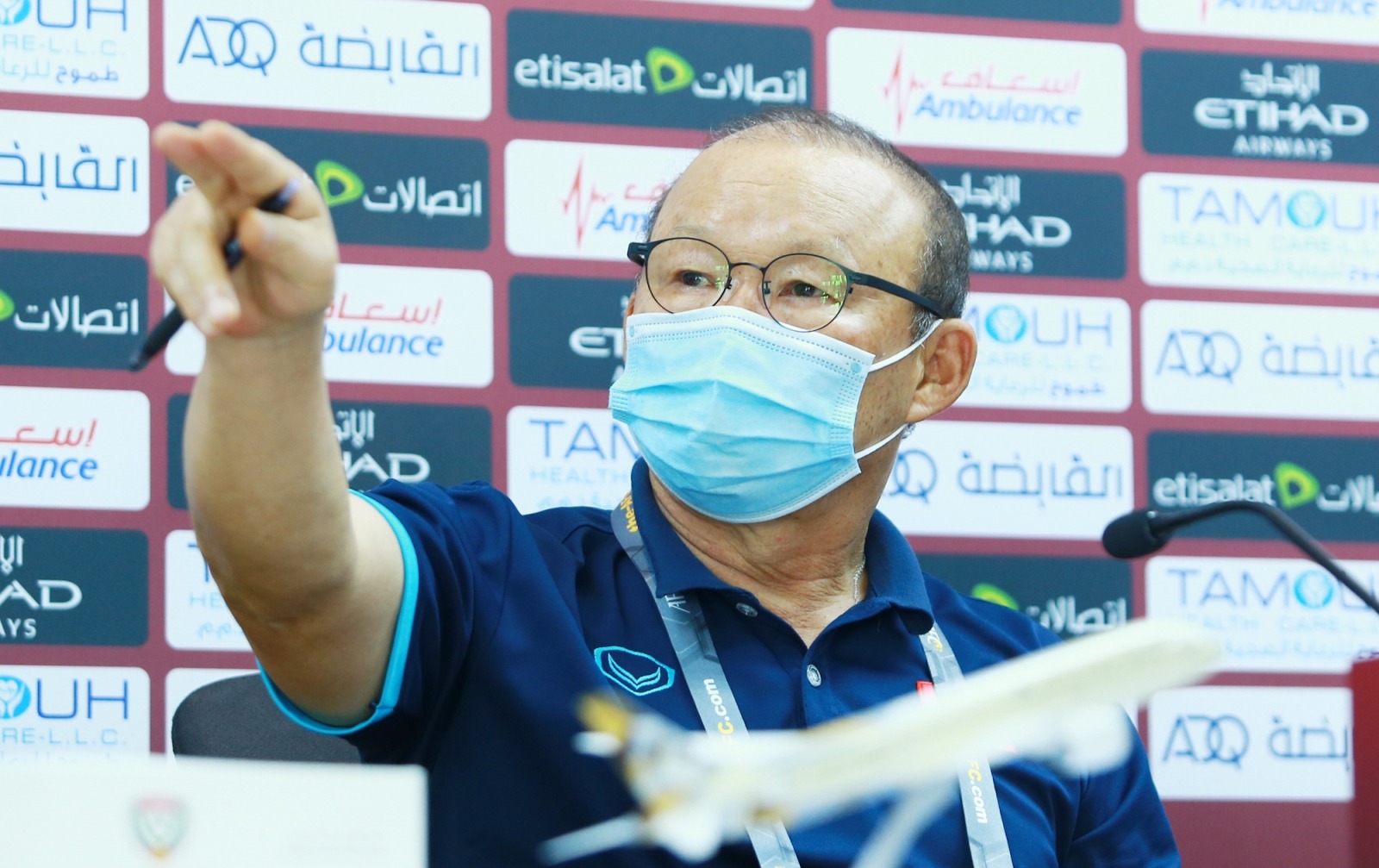 Phát hiện hành động, chiến lược gia Park Hang-seo chỉ tay về phía phóng viên UAE gay gắt yêu cầu dừng ngay lập tức.