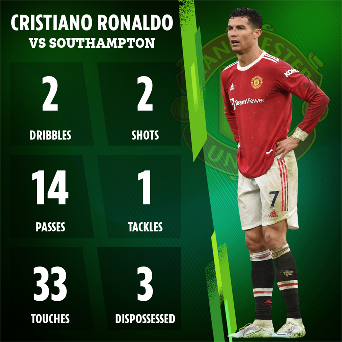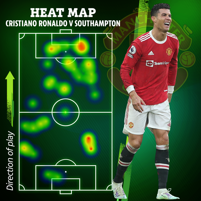 Trong toàn bộ 90 phút, Ronaldo chỉ thực hiện được 14 đường chuyền. Bản đồ nhiệt của Ronaldo ở màn so tài với Sothampton cũng chỉ ra rằng anh phải vật lộn để theo kịp với một cuộc tranh chấp tốc độ nhanh tại Old Trafford. Số 7 để mất bóng 3 lần trước Southampton, điều đó cho thấy anh gặp vấn đề ở khâu giữ bóng.
