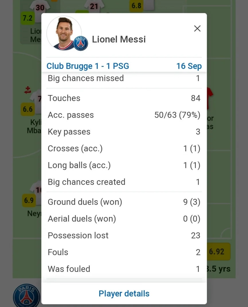 Tỷ lệ chuyền bóng thành công của M10 cũng không ấn tượng, khi chỉ đạt 79%. Messi chỉ có hai pha dứt điểm về phía khung thành Brugge, một đi trúng đích. Trong 9 pha tranh chấp với đối phương, số 30 của PSG chỉ thắng 3.
