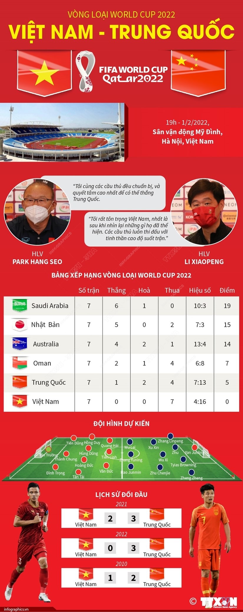 Trận đấu giữa đội tuyển Việt Nam và đội tuyển Trung Quốc trong khuôn khổ vòng loại World Cup 2022 diễn ra vào lúc 19 giờ ngày 1/2/2022 trên Sân vận động quốc gia Mỹ Đình.
