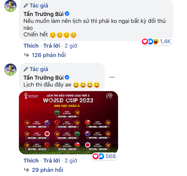 Không chỉ thế, anh còn nêu cao tinh thần quyết chiến quyết thắng dưới phần bình luận. "Nếu muốn làm nên lịch sử thì phải ko ngại bất kỳ đối thủ nào. Chiến hết", Bùi Tấn Trường viết. Phát ngôn của Bùi Tấn Trường nhận về lia lịa những lượt "thả tim" từ cộng đồng mạng. Ai cũng hừng hực khí thế, mong chờ trận thi đấu của đội tuyển Việt Nam và đúng mồng 1 Tết âm lịch năm nay.
