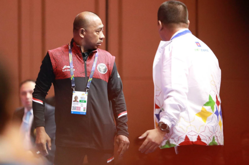 HLV Yusran Arief của đội karate Indonesia tức giận lao lên sàn đấu phản ứng trọng tài, bị ban tổ chức tước thẻ và mời ra ngoài. Sau đó, những thành viên khác của đội tuyển tiếp tục có loạt phản ứng gay gắt với đội ngũ an ninh tại nhà thi đấu Chroy Changvar.