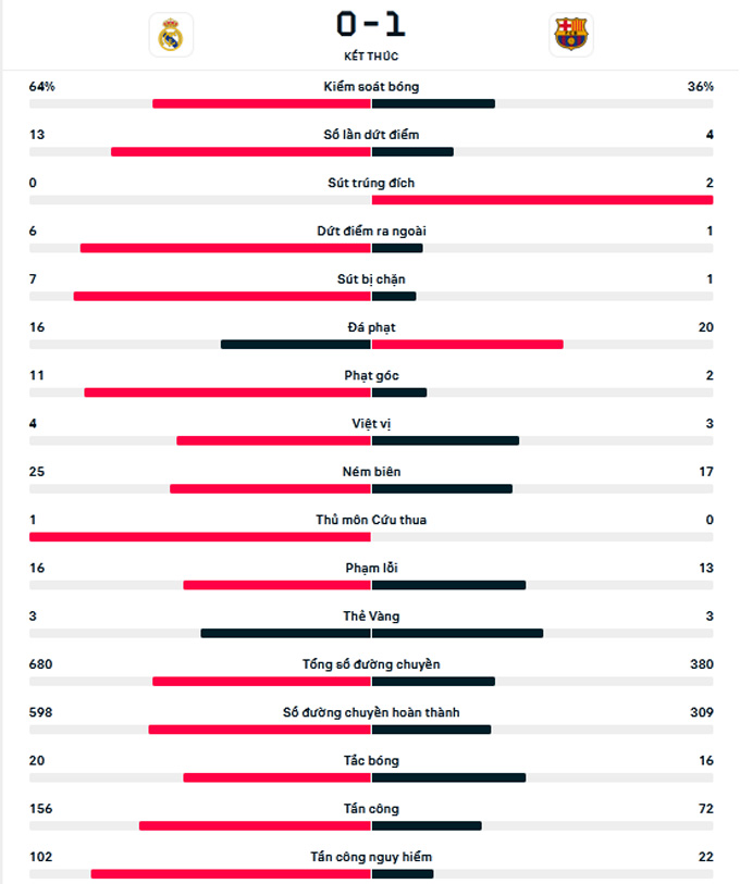 Những phút cuối trận, Real gia tăng sức ép về phía khung thành Barca. Tuy nhiên, hàng thủ đội khách đã chơi kỷ luật và lăn xả để bảo vệ thành công tỷ số 1-0. Với kết quả này, thầy trò HLV Xavi có lợi thế không nhỏ trước trận lượt về khi họ được chơi trên sân nhà Nou Camp.