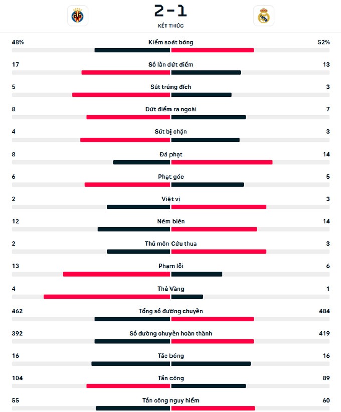 Trận đấu kết thúc với tỷ số 2-1 nghiêng về phía đội chủ nhà. Villarreal tạm leo lên vị trí thứ 5 trên BXH. Trong khi đó, Real có nguy cơ bị đội đầu bảng Barca nới rộng cách biệt lên thành 3 điểm.