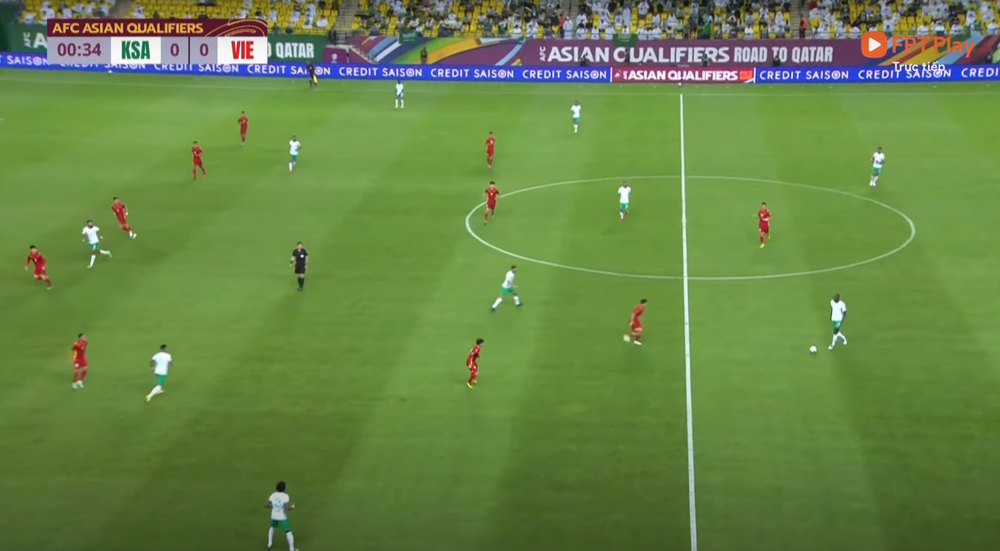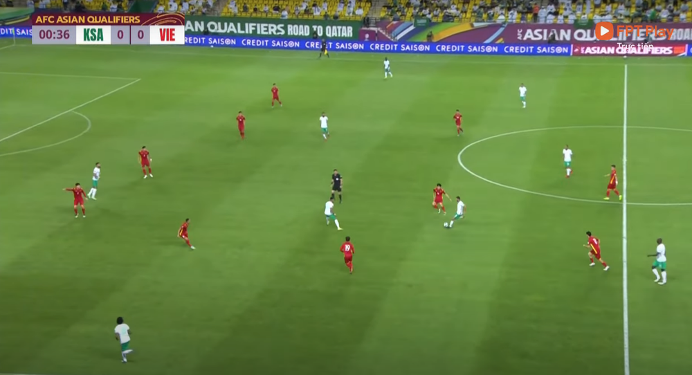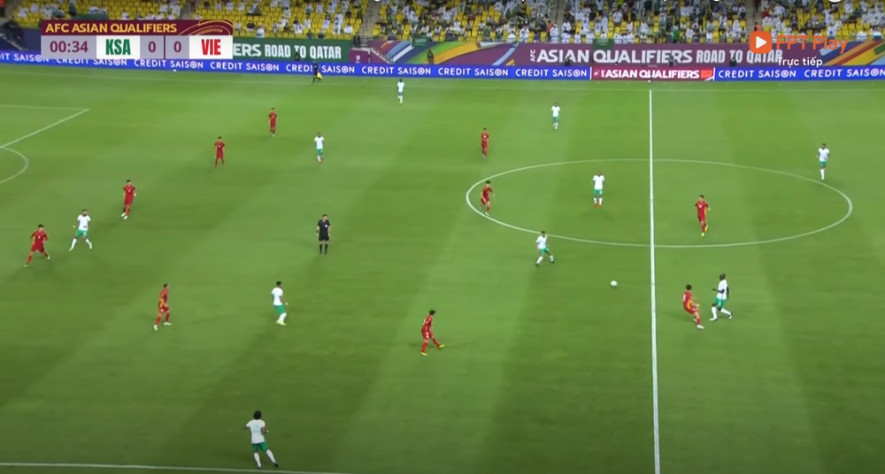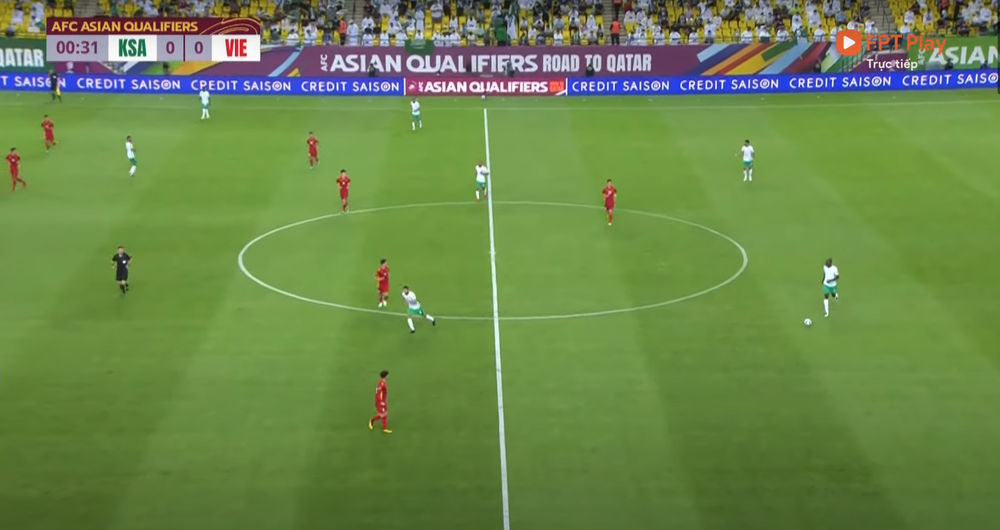 Giây thứ 31 của trận đấu, sơ đồ đội tuyển Việt Nam vận hành đúng 5-4-1 với 4 tiền vệ giăng ngang ở sân nhà chờ đợt tấn công của đối phương, với Tuấn Anh và Quang Hải ở bên phải.