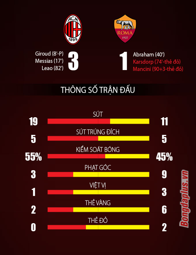 Đến phút 82, Rafael Leao chấm dứt mọi nỗ lực của Roma. Lão tướng Ibrahimovic vào sân trong hiệp 2 đã có đường kiến tạo thuận lợi cho đàn em người Bồ Đào Nha dứt điểm ấn định chiến thắng cho Milan. Với thắng lợi này Milan đã củng cố vị trí nhì bảng với 45 điểm, bám sát ngay phía sau Inter Milan với 1 điểm ít hơn. Trong khi đó, Roma đã nhận thất bại thứ 8 ở mùa giải này và an phận ở vị trí thứ 7 trên BXH với 32 điểm.