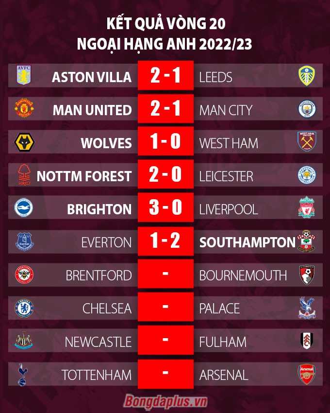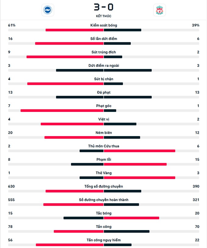 Kết quả cuối cùng của trận đấu là 3-0 nghiêng về phía đội chủ nhà. Chiến thắng này giúp Brighton vượt qua chính Liverpool để chiếm lấy vị trí thứ 7 trên BXH với 2 điểm nhiều hơn.