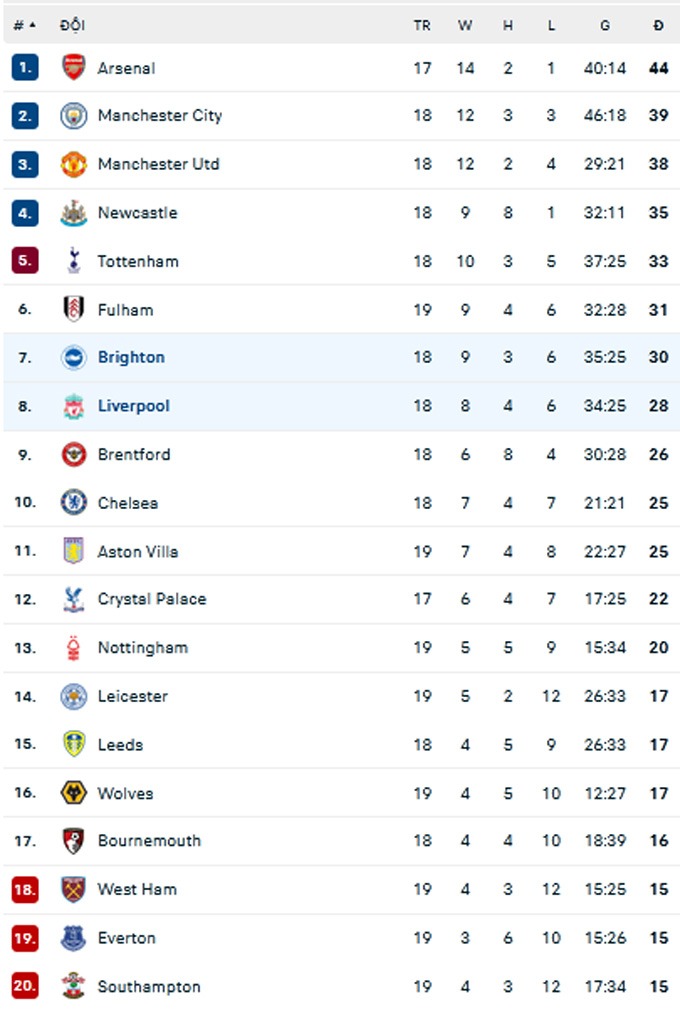 BXH Premier League 2022/23