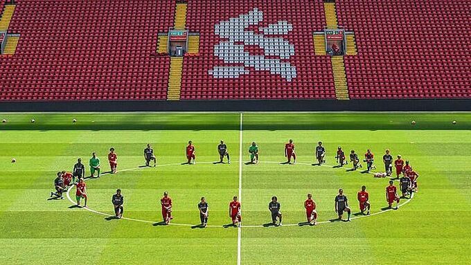 Nhiều ngôi sao của Liverpool, trong đó có Georginio Wijnaldum, James Milner, Virgil Van Dijk và Andy Robertson, chia sẻ bức ảnh toàn đội quỳ gối lên mạng xã hội với thông điệp: "Đoàn kết là sức mạnh".