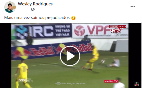 Cụ thể, trên trang facebook cá nhân, Wesley Rodrigues đã đăng tải lại tình huống ở phút 90+4 kèm theo dòng trạng thái: "Một lần nữa chúng tôi lại bị hại".