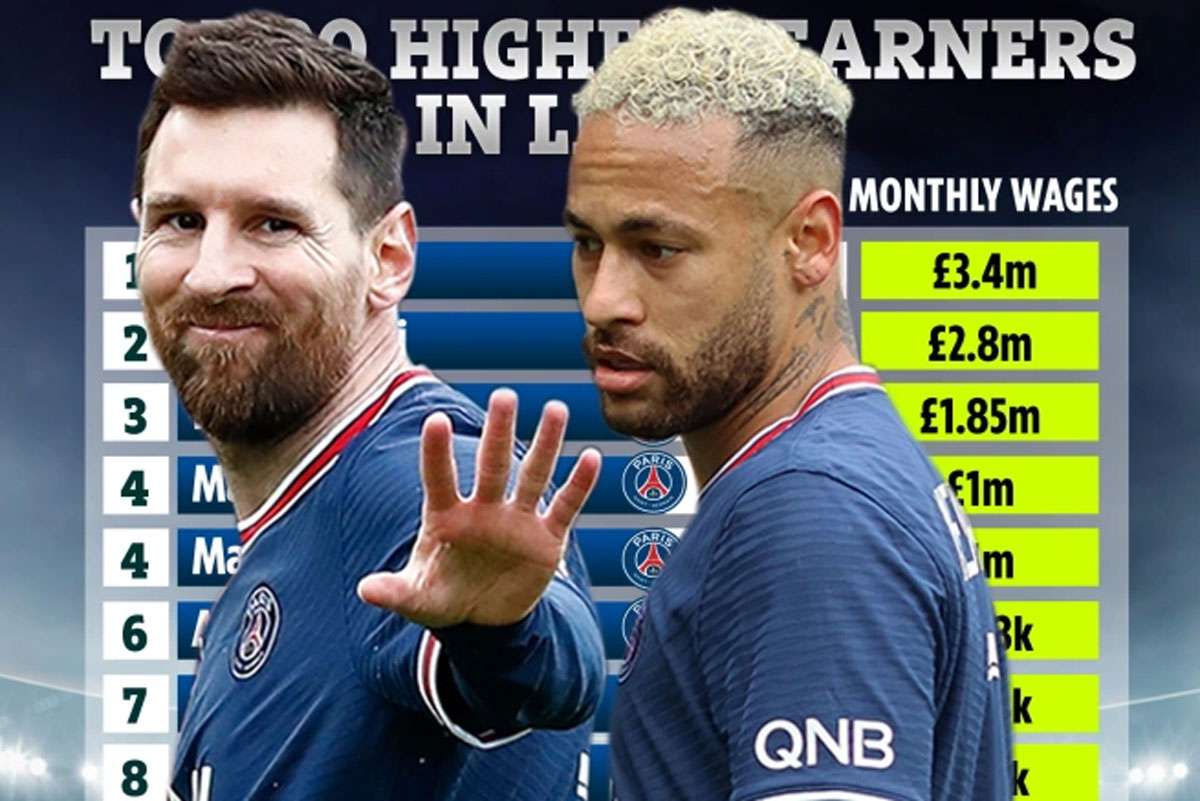 Theo số liệu do L'Equipe công bố, tiền đạo Neymar kiếm được 3,4 triệu bảng mỗi tháng. Người đồng đội Messi nhận về nhà 2,8 triệu bảng mỗi tháng, trong khi Mbappe kiếm được 1,85 triệu bảng. Trung vệ Marquinhos và tiền vệ Marco Verratti của Les Parisiens hoàn thành top 5 khi họ kiếm được 1 triệu bảng mỗi người.