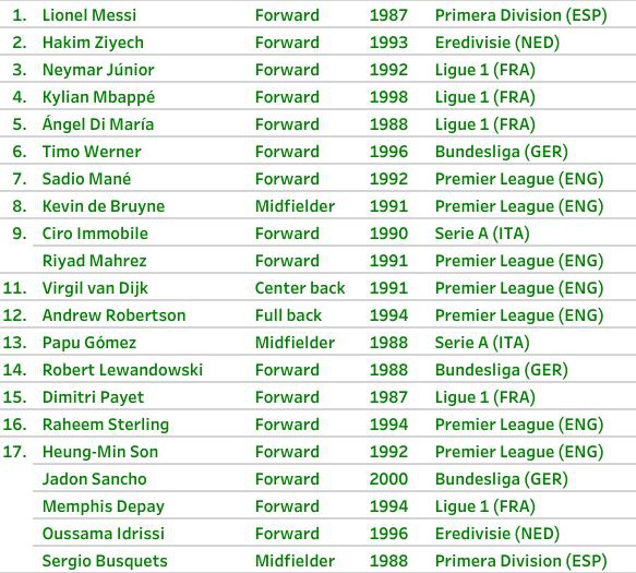 Virgil Van Dijk, trung vệ số 1 thế giới hiện tại, người có cuộc cạnh tranh sòng phẳng với Lionel Messi trong cuộc đua Quả bóng Vàng 2019, chỉ đứng ở vị trí thứ 11 với 350 điểm. Đồng đội của Van Dijk, Mohamed Salah thậm chí còn bị đánh giá thấp hơn khi đứng thứ 29 với 334 điểm.
