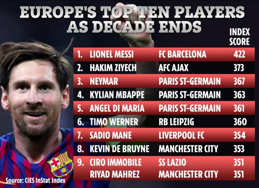Mới đây, trung tâm nghiên cứu CIES vừa công bố bảng xếp hạng những cầu thủ xuất sắc nhất thế giới ở thời điểm hiện tại, và vị trí số 1 đã thuộc về chủ nhân của danh hiệu Quả bóng Vàng 2019, Lionel Messi. Với màn thể hiện đặc biệt xuất sắc trong mùa giải vừa qua, siêu sao người Argentina được chấm 422 điểm và bỏ xa nhóm bám đuổi.