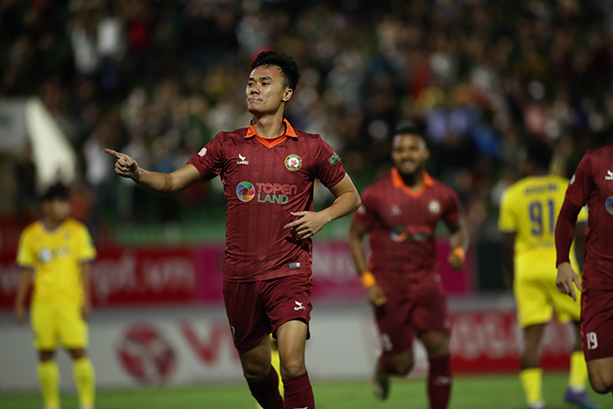 Từ quả đá phạt của Xuân Tú, Xuân Nam bật cao đánh đầu hạ gục thủ môn Văn Tiến, đưa Bình Định vượt lên dẫn trước.
