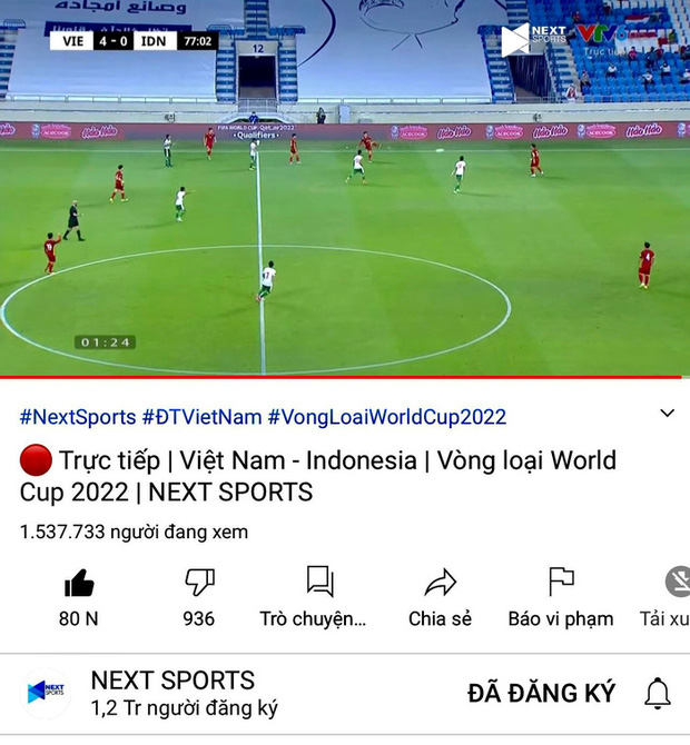 Theo thông tin từ Next Media (đơn vị sở hữu bản quyền vòng loại thứ 2 World Cup 2022 của ĐT Việt Nam) chỉ thống kê riêng hai kênh truyền thông Next Sports của Next Media trên YouTube là 1.537.733 lượt xem cùng lúc và Facebook 475,7k lượt xem cùng lúc, tổng cả 2 nền tảng trên của Next Sports đã có hơn 2 triệu lượt xem cùng thời điểm với gần 15 nghìn lượt chia sẻ, top 1 trending trên YouTube và gần 15 triệu lượt xem trực tiếp trận đấu, dù chỉ giới hạn tại Việt Nam.