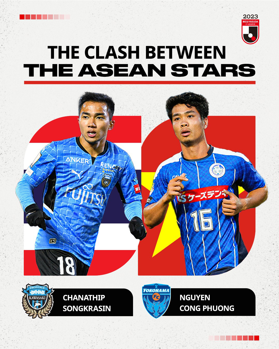 Trang facebook của J-League viết: "Chanathip Songkrasin (Kawasaki Frontale) - Nguyễn Công Phượng (Yokohama FC). Trận chiến của những ngôi sao Đông Nam Á tại J-League.
