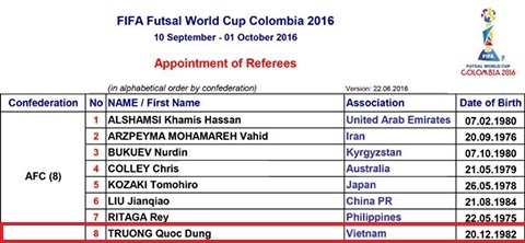 Theo đó, trọng tài futsal xuất sắc nhất của Việt Nam ở thời điểm hiện tại là Trương Quốc Dũng được FIFA lựa chọn vào danh sách đội ngũ trọng tài điều khiển tại VCK Futsal World Cup 2016.