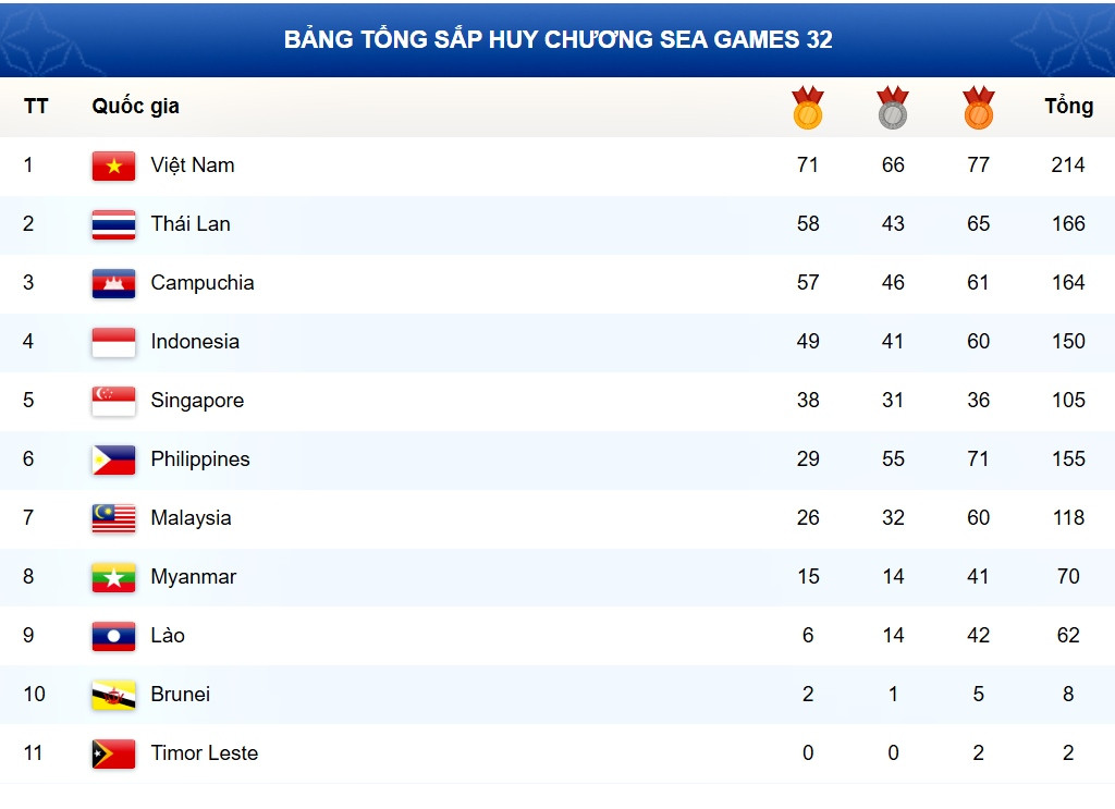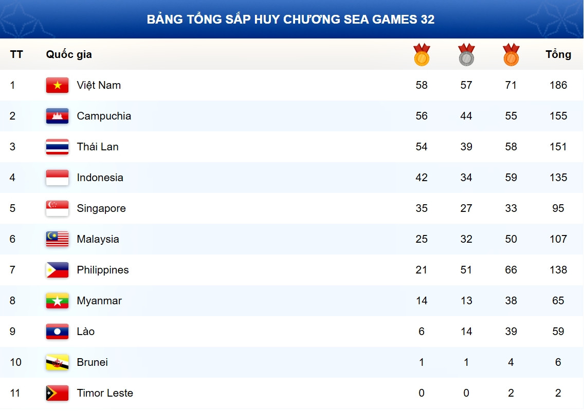 Bảng tổng sắp huy chương SEA Games 32 mới nhất