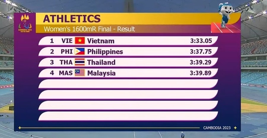 Đội chạy tiếp sức 4x400m nữ tỏ ra không có đối thủ khi cán đích đầu tiên, với thành tích 3 phút 33 giây 05, trước đối thủ nặng ký Philippines và Thái Lan để giành HCV.