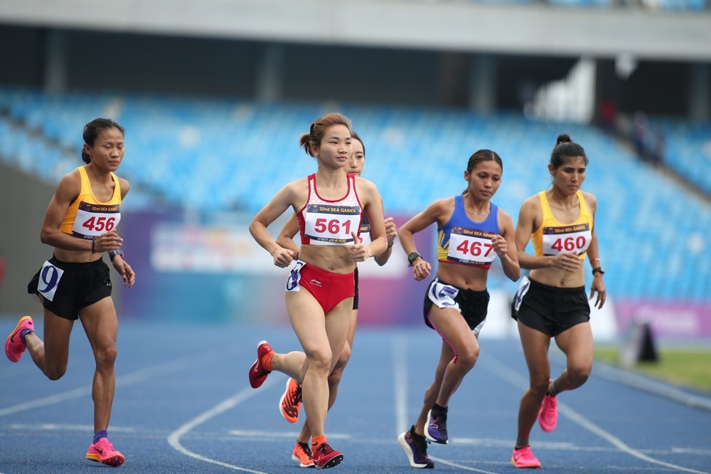 Cô gái vàng của thể thao Việt Nam Nguyễn Thị Oanh (số đeo 561) cùng ĐKVĐ Phạm Thị Hồng Lệ (số đeo 599) bắt đầu thi đấu nội dung chạy 10.000m nữ tại SEA Games 32. Ở nội dung này, có tất cả 14 VĐV tranh tài.