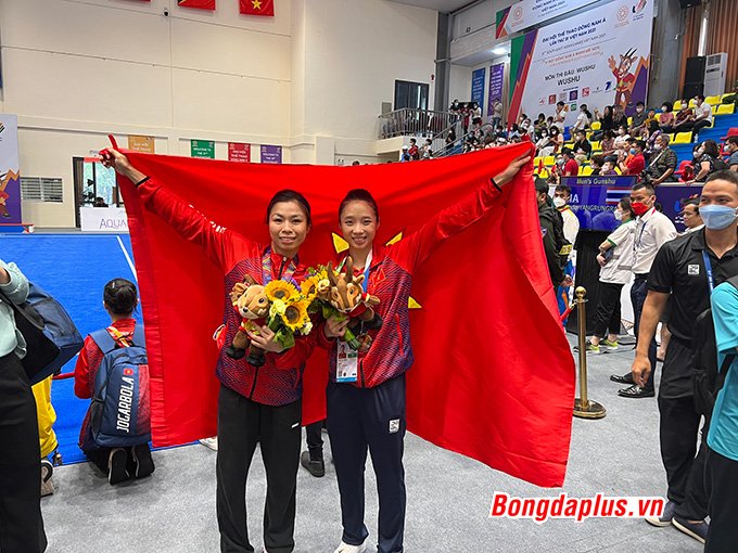 Hai VĐV Wushu Hoàng Thị Phương Giang (HCV) và Dương Thúy Vi (HCĐ) nội dung trường quyền.