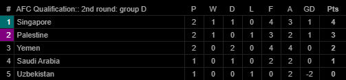 Bảng D đang diễn ra đầy thú vị. Sau 2 lượt trận, Singapore dẫn đầu bảng với 4 điểm. Trong khi 2 đội bóng được đánh giá rất cao là Saudi Arabia và Uzbekistan lại đứng cuối bảng.