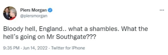 Tờ The Sun của Anh gọi trận thua này là một sự sỉ nhục. Trong khi đó, Piers Morgan, một nhà báo nổi tiếng ở Anh lên tiếng: "Chuyện quái gì đang diễn ra vậy Southgate?". Đủ để thấy nước Anh đang phẫn nộ như thế nào trước trận thua sáng nay.