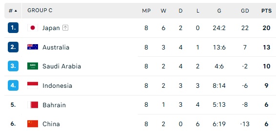 Hiện ở bảng C vòng loại 3 World Cup 2026, tuyển Indonesia đang xếp thứ 4 với 9 điểm sau 8 vòng đấu, nắm lợi thế lớn trong cuộc đua đi tiếp vào vòng loại thứ 4. Chỉ cần đánh bại tuyển Trung Quốc trên sân nhà ở lượt trận áp chót, đồng thời Bahrain không thắng được Saudi Arabia, tuyển Indonesia sẽ chắc chắn đi tiếp bất chấp kết quả ở lượt trận cuối cùng.