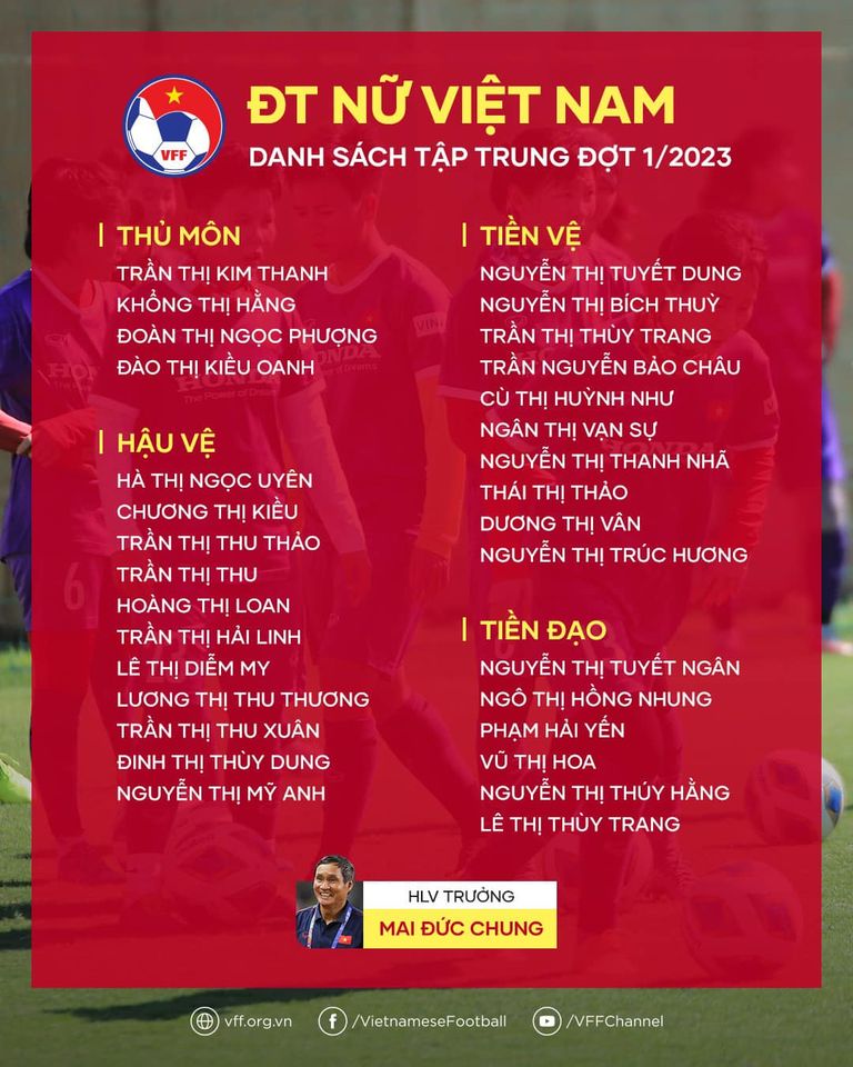 Theo đó, danh sách đội tuyển nữ Quốc gia dự kiến có 31 cầu thủ thuộc các đơn vị TP HCM (11 cầu thủ), Hà Nội (8 cầu thủ), Than KSVN (8 cầu thủ), Hà Nam và Thái Nguyên – mỗi địa phương 2 cầu thủ. Ngoài những gương mặt trụ cột, đã cùng đội tuyển nữ Quốc gia thi đấu tại SEA Games 31 và giải Đông Nam Á 2022, có một số gương mặt lần đầu tiên được huấn luyện viên Mai Đức Chung gọi lên tập trung như: Đoàn Thị Ngọc Phượng (thủ môn), Hà Thị Ngọc Uyên, Ngô Thị Hồng Nhung và Vũ Thị Hoa.