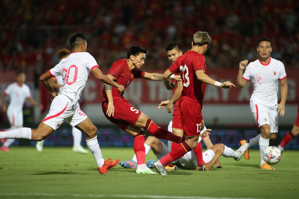 Từ quả tạt bên cánh trái của cầu thủ Hong Kong, bóng đi sâu và dội xà ngang khung thành Văn Lâm. Văn Hậu trong nỗ lực cản phá bị đau khi tranh chấp với tiền đạo đội bạn.