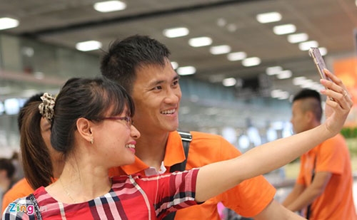Sân bay lúc này khá đông người Việt Nam đi du lịch. Một nữ du khách đã níu kéo Công Vinh nán lại xin chụp kiểu ảnh chung. |