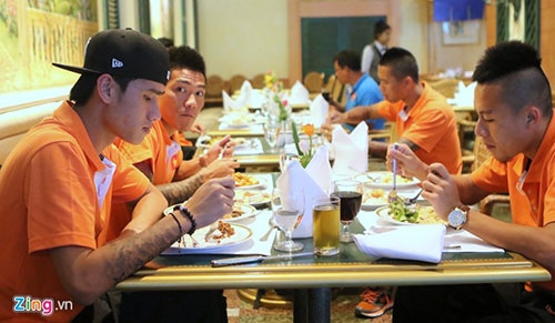 Quang Hải và các đồng đội ăn vội bữa buffet ngay tại khách sạn. 16h30 chiều nay, ĐT Việt Nam sẽ có buổi tập đầu tiên trên sân vận động Royal Thai Army. Từ khách sạn tới sân tập khoảng 40 phút ôtô. |