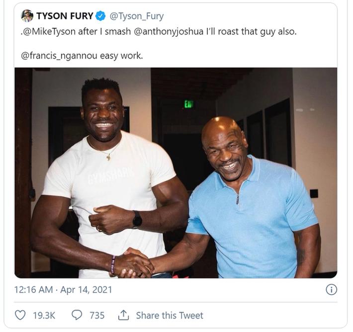 "Mike Tyson này, sau khi tôi hủy diệt Anthony Joshua, tôi sẽ hạ đẹp gã này luôn. Francis Ngannou, một công việc dễ dàng", Fury chia sẻ đăng kèm bức ảnh Ngannou đang chụp cùng Mike Tyson.