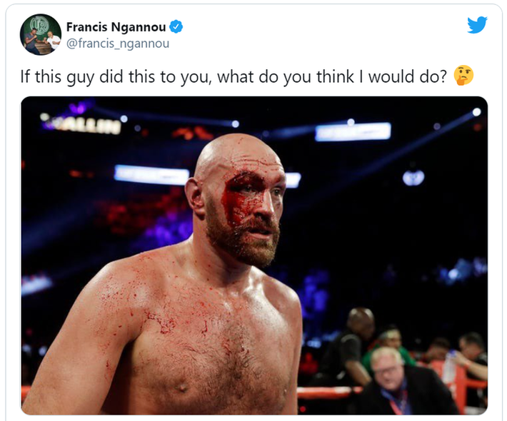 Bị đánh giá thấp, Ngannou cũng nhanh chóng lên tiếng. Võ sĩ 35 tuổi đăng tấm hình gương mặt Fury đang đầy máu (trong trận gặp Otto Wallin năm 2019) cùng dòng chú thích: "Nếu võ sĩ nọ làm như thế này với anh, vậy anh nghĩ tôi có thể làm gì?".