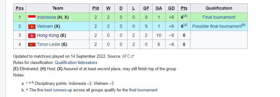 Sai hai lượt, Việt Nam và Indonesia đang cùng sáu điểm, ghi chín bàn và thủng một bàn. Indonesia đứng đầu bảng, do hơn Việt Nam chỉ số fair-play, dựa trên thẻ phạt hai đội phải nhận.