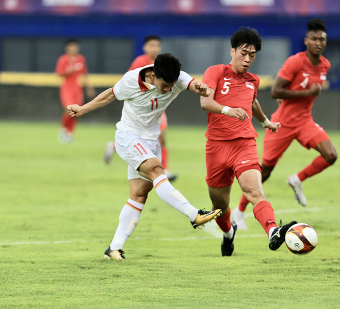Văn Khang vừa tung cú sút chéo góc, đưa bóng vọt xà. Trước đó, Văn Trường tung cú dứt điểm từ xa nhưng thủ môn U22 Singapore đã ôm gọn.
