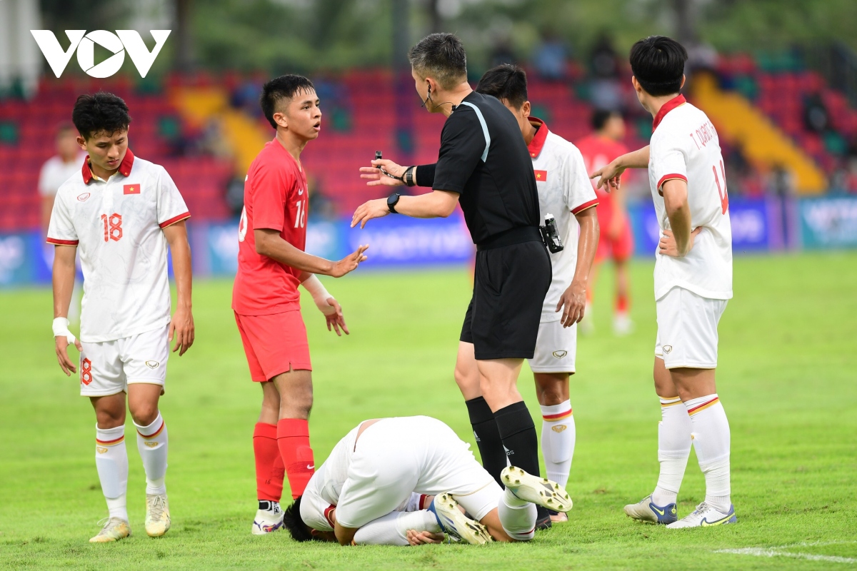 Một pha vào bóng bằng gầm giầy rất nguy hiểm của cầu thủ U22 Singapore với Tuấn Tài khiến hậu vệ U22 Việt Nam nằm sân. Trọng tài đứng rất gần tình huống va chạm nhưng không rút thẻ. May mắn là sau khi được chăm sóc Tuấn Tài vẫn có thể thi đấu.