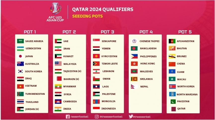 AFC đã công bố các nhóm hạt giống chính thức tại vòng loại U23 châu Á 2024, sẽ diễn ra từ ngày 4 đến 12.9.2023.