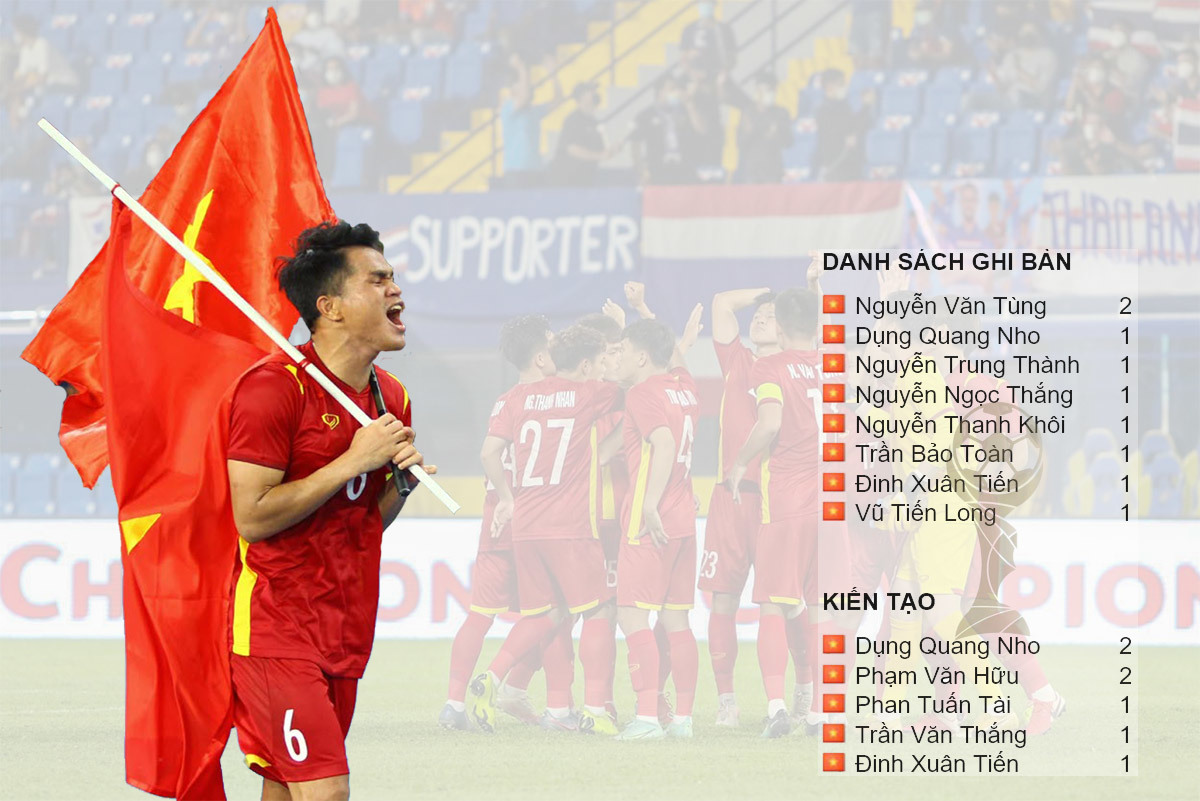 Trong hành trình 4 trận đấu ở Campuchia, có đến 8 cầu thủ khác nhau của Việt Nam ghi bàn.