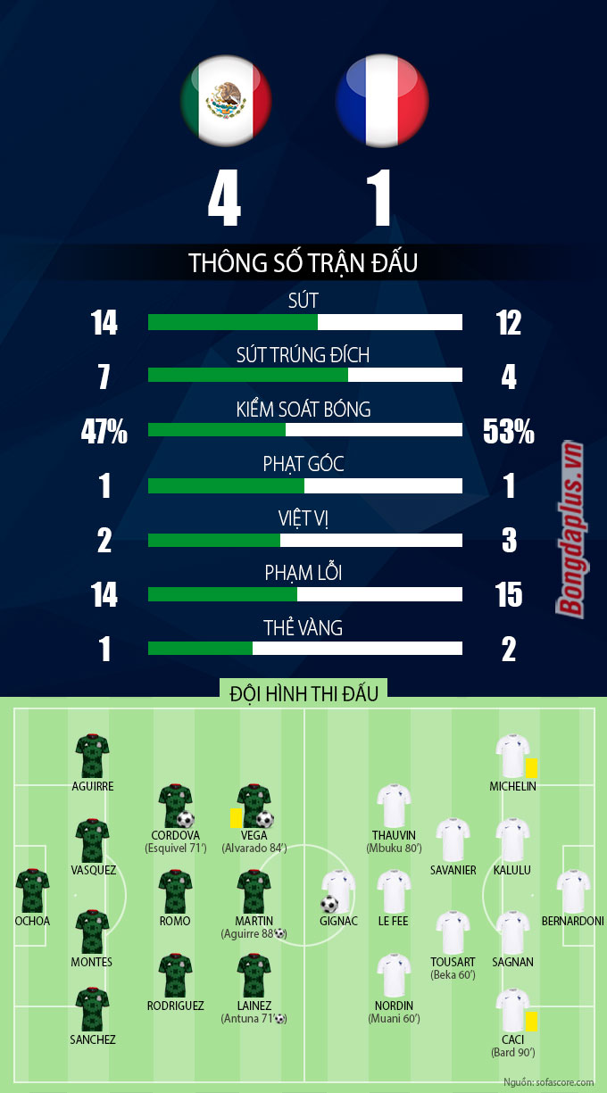 Thua chung cuộc 1-4, U23 Pháp trải qua khởi đầu không thể tệ hơn ở Olympic Tokyo 2020. Vào ngày 25/7 tới, U23 Pháp sẽ gặp U23 Nam Phi, trong khi U23 Mexico gặp chủ nhà U23 Nhật Bản.