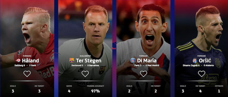 Thay vào đó, UEFA công bố 4 ứng viên cho danh hiệu Cầu thủ xuất sắc nhất lượt 1 vòng bảng C1 gồm Mislav Orsic (Dinamo Zagreb), Angel Di Maria (PSG), Erling Braut Haaland (RB Sazlburg) và Marc-Andre ter Stegen (Barcelona). Trong đó, đáng chú ý nhất là Haaland của Sazlburg khi anh có cú hat-trick vào lưới Genk, qua đó giúp đội nhà giành chiến thắng đậm đà 6-2. Tương tự với Haaland, Mislav Orsic cũng có hat-trick vào lưới Atalanta.
