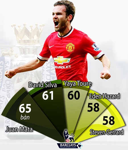 Thống kê cho thấy, Mata đã in dấu giày trong 65 bàn thắng (31 bàn, 34 kiến tạo) ở Premier League kể từ mùa 2011/12. Như vậy, Mata là tiền vệ đóng góp vào nhiều bàn thắng nhất ở giải đấu này từ mùa 2011/12, hơn David Silva (61), Yaya Toure (60), Eden Hazard (58) và Steven Gerrard (58). |