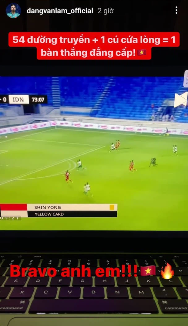 Trên trang cá nhân, thủ môn Đặng Văn Lâm chia sẻ đoạn video bàn thắng của Văn Thanh cùng lời tán thưởng: "54 đường chuyền, một cú cứa lòng, bàn thắng đẳng cấp".