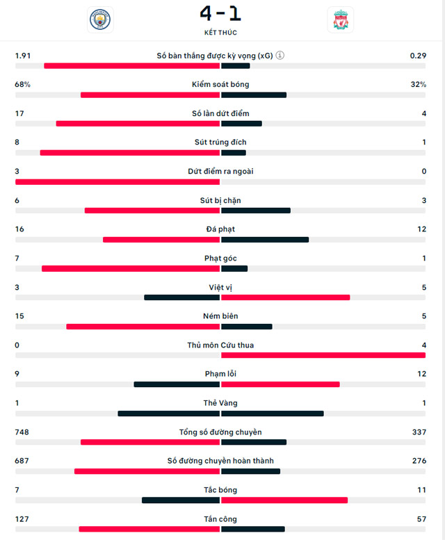 Thủng lưới chóng vánh ở ngay đầu hiệp 2, Liverpool chơi như “gà mắc tóc” còn Man City càng đá càng hay. Đến phút 74, Grealish ấn định thắng lợi 4-1 cho nhà ĐKVĐ. Vượt qua Liverpool, Man City có 64 điểm và tạm thu hẹp khoảng cách với đội đầu bảng Arsenal xuống còn 5 điểm.