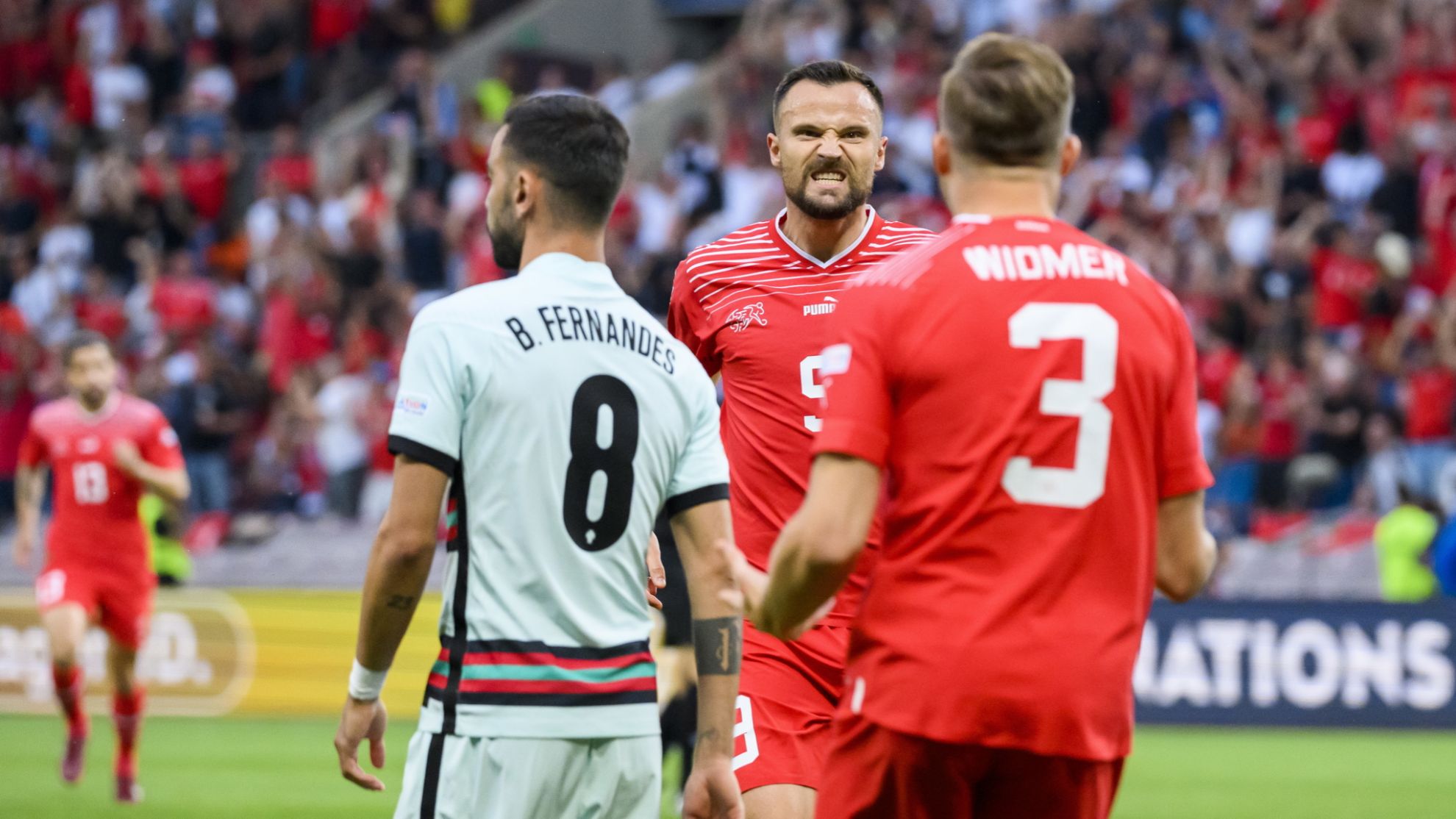Ngay ở phút đầu tiên, Bồ Đào Nha đã bị thủng lưới. Shaqiri phối hợp với Widmer bên cánh phải trước khi hậu vệ này tung ra đường chuyền như đặt để tiền đạo Seferovic đánh đầu tung lưới Rui Patricio.