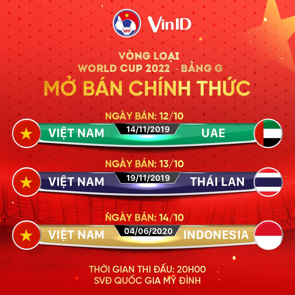 Và vào ngày 14/10, VFF sẽ mở bán vé cho trận đấu với ĐT Indonesia vào năm 2020. Vé sẽ được bán online qua kênh chính thức là vebongda.vff.org.vn và ứng dụng Vin ID.